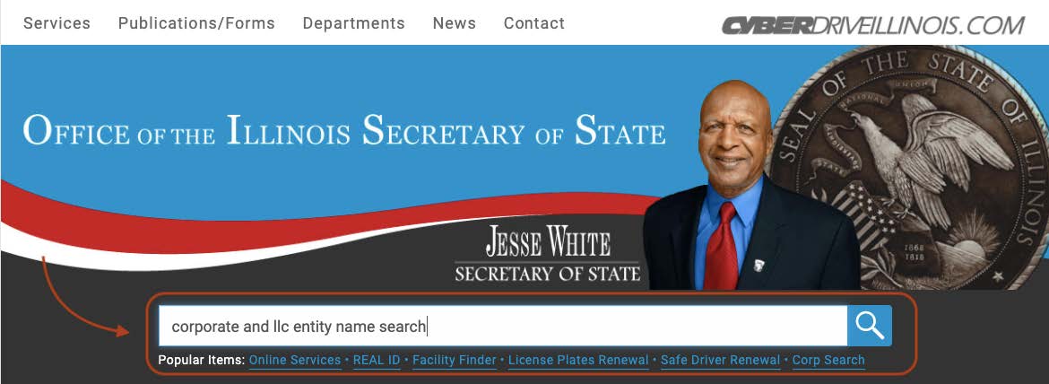 2. Once you’ve read and understood the rules (you may want to consult an attorney here), run a quick name search while you’re still in your state’s website. For example, I ran a quick entity name search in Illinois and included visuals below.