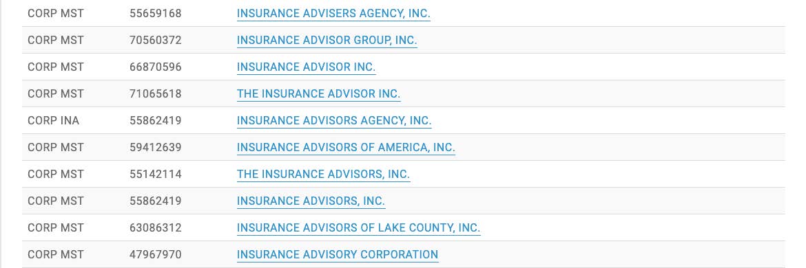 d. I got a list of every corporation and LLC in the state of Illinois that has “insurance advisor” in its name.