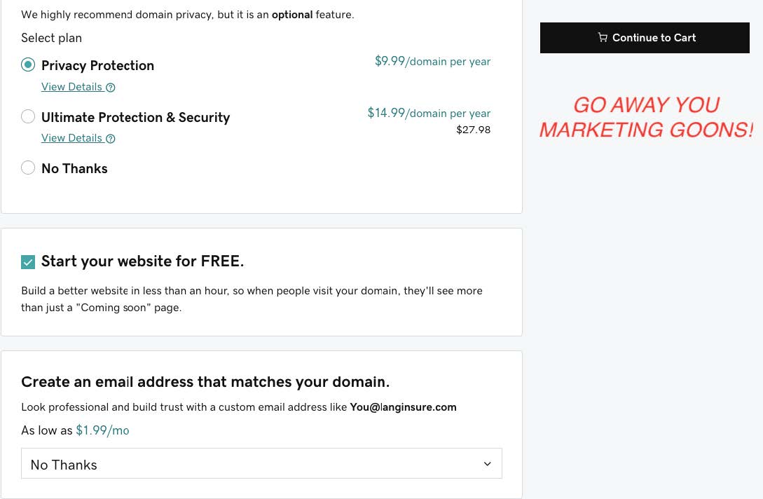 f. Most domain service providers are going to try and sell you everything under the sun once you go to your cart. If you are simply trying to reserve the rights to that company name online (i.e. your future URL) you can simply skip over all of the “add ons.” It is very easy to come back and add additional products and features at a later time.